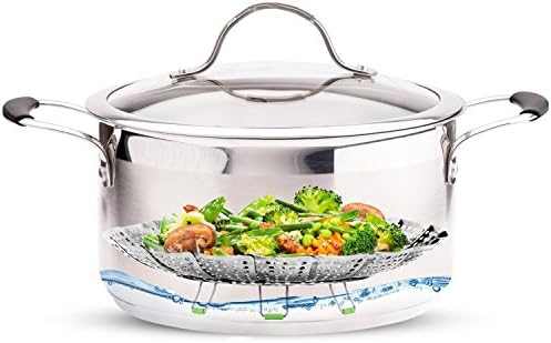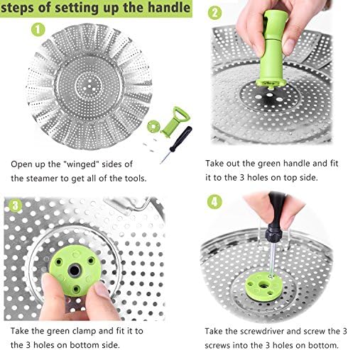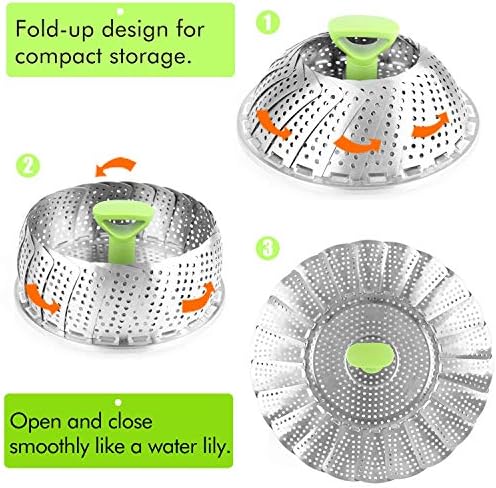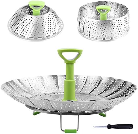 About this item HEALTHIER COOKING CHOICES – The steamer basket with high quality stainless steel petals, food grade plastic handle and silicone feet will guarantee your health. Steaming is a healthy cooking choice because it helps retain more than 90% of the nutrients lost when either boiling or microwaving food. The foldable steamer basket can be used to steam veggies, seafood, eggs, meats, desserts, baby food and much more. EXPANDABLE and COLLAPSIBLE – Vegetable steamer basket collapsed diameter is 5.1 inches. It expands to 9 inches once petals are stretched out. The “wings” that fold in and out allow the steamer fit various pot/pan sizes or pressure cooker, turning any pan into a steamer. Opens like a water lily and it folds compactly to save storage space unlike bulky bamboo steamers. FOLDABLE LEGS & REMOVABLE CENTER POST – Three foldable legs with silicone will not scratch your pot. They are 1.2 inch in length to keep food above boiling water so that it doesn’t burn. 2.9″ Central post helps easy insertion to the deep pots and safe removal from the boiling water, and it is removable to steam large items Like corn on the cob. When your food is ready, remove it from the boiling water with a fork so you won’t burn your fingers. MULTIPLE FUNCTIONS – Not only can it be used as a food steamer basket, but also can be used as a strainer or fruit container. You can also use it to filter extra water when making salad. From busy moms to college students to culinary artist, this product is a definitely a must have for anyone who wants to get more health into their diet. It comes in a perfect sized box makes it an awesome GIFT for your family & friends. SATISFACTORY SERVICE – We pride ourselves in having the premium steamer insert. As such, your satisfaction is guaranteed. For whatever reason, if you have any issues with the steamer basket, please contact us and we will give you a best solution.Don’t hesitate! Click “Add to Cart.”