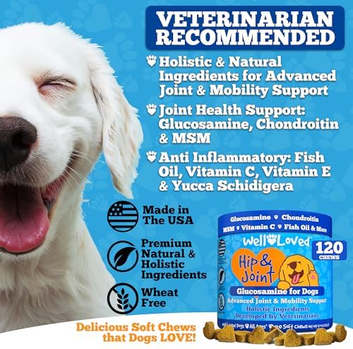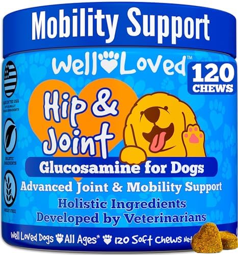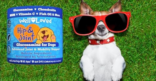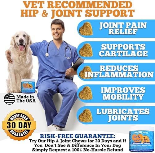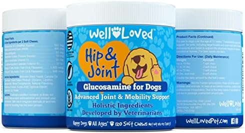 About this item Glucosamine for Dogs – Well Loved Dog Hip and Joint Supplement is an advanced veterinarian formulated soft chew with glucosamine, chondroitin, MSM and more to help support dog joint health and mobility. It’s a natural, safe and effective solution to prevent hip and joint pain and stiffness often caused due to age, activity or trauma. Hip and Joint Supplement Dogs – Your dog is sure to love our taste tested, veterinarian developed, made in the USA, dog joint chews. Our natural and holistic ingredients work together to safely and effectively provide joint support for dogs and dog joint pain relief. Only Natural Ingredients – Formulated for all dog breeds, ages and sizes (large or small). Well Loved Chews Hip and Joint for Dogs are grain free with NO dairy, NO sugar, and NO artificial flavoring added for a natural dog hip and joint support supplement. Researched and vet developed with your pet’s health and safety as our top priority. Flavor That Dogs Love – Our dog glucosamine soft chews start to provide benefits within 1-2 weeks of daily use. With no artificial flavors, just a delicious natural taste that’s gentle and effective. Even most finicky eaters love our dog joint treats. Also known as glucosamine dogs, joint chews for dogs, dog joint supplement large breed, dog glucosamine and chondroitin supplement large dog, glucosamine for dogs hip and joint supplement, & dog joint supplements. A Brand You Can Trust – Unlike other brands that claim “American Quality” while making their products overseas our Well Loved Hip & Joint Chews are made in the USA and manufactured in a GMP compliant facility. In addition, developed by veterinarians so you can rest assured that you are giving your fur babies a premium quality pet supplement.